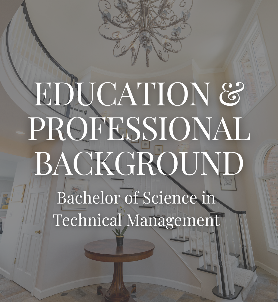 Before beginning a real estate career, I built a strong foundation in business, leadership, and client relations. I earned my Bachelor of Science in Technical Management, which gave valuable insight into how organizations operate, how marketing connects people to products, and how exceptional service builds trust - skills I draw on every day in real estate.